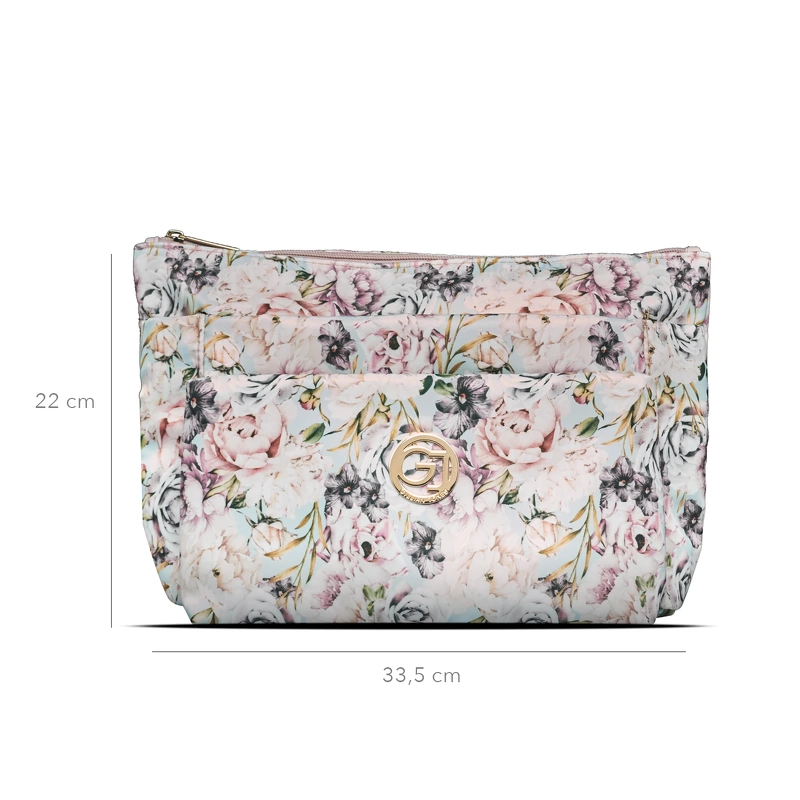 Gillian Jones 3 Room Cosmetics Bag - Flower Print 10009-752 er en stor kosmetiktaske med tre rum, som er designet med det smukkeste blomsterprint, der giver et meget feminint udtryk. Denne makeuptaske er et must-have for dig der ønsker at opbevare og organisere dine produkter på en praktisk og stilren måde.