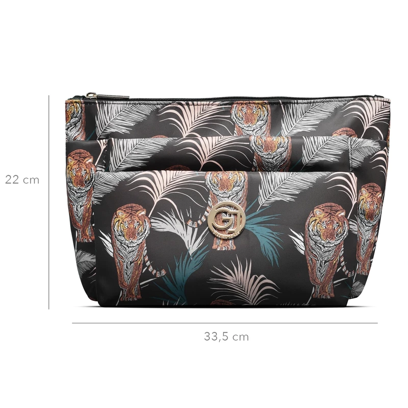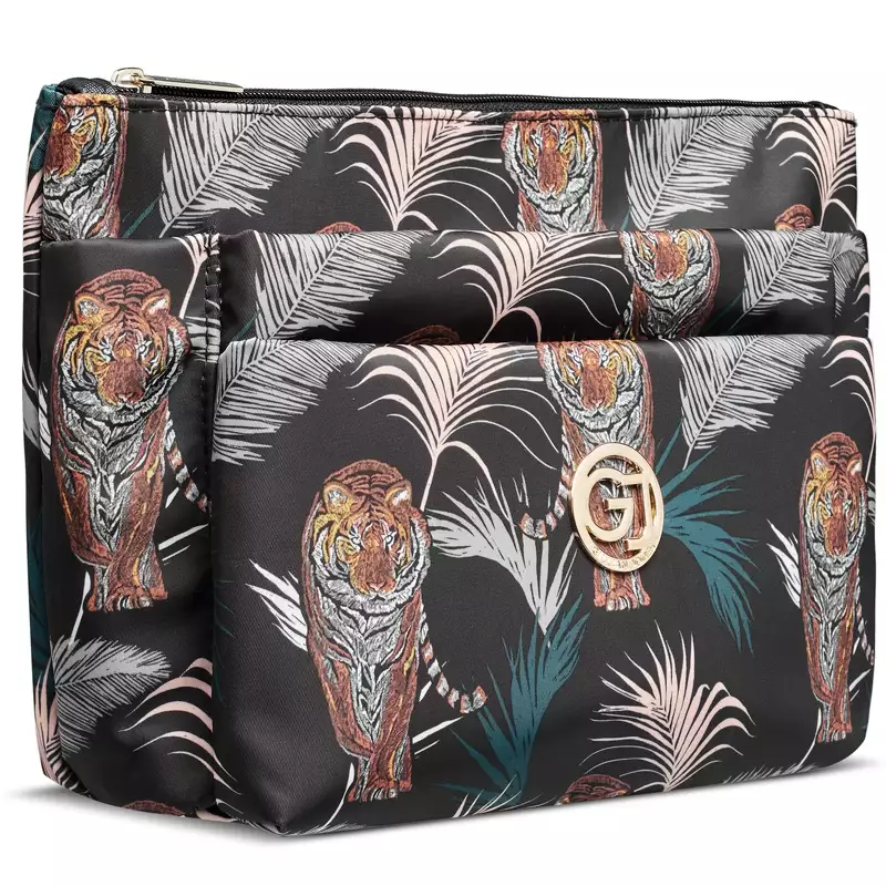 Gillian Jones 3 Room Cosmetics Bag - Palm Print er en stor kosmetiktaske med tre rum, som er designet med et utroligt flot print med tigere og palmeblade. Denne makeuptaske er et must-have for dig der ønsker at opbevare og organisere dine produkter på en praktisk og stilren måde.
