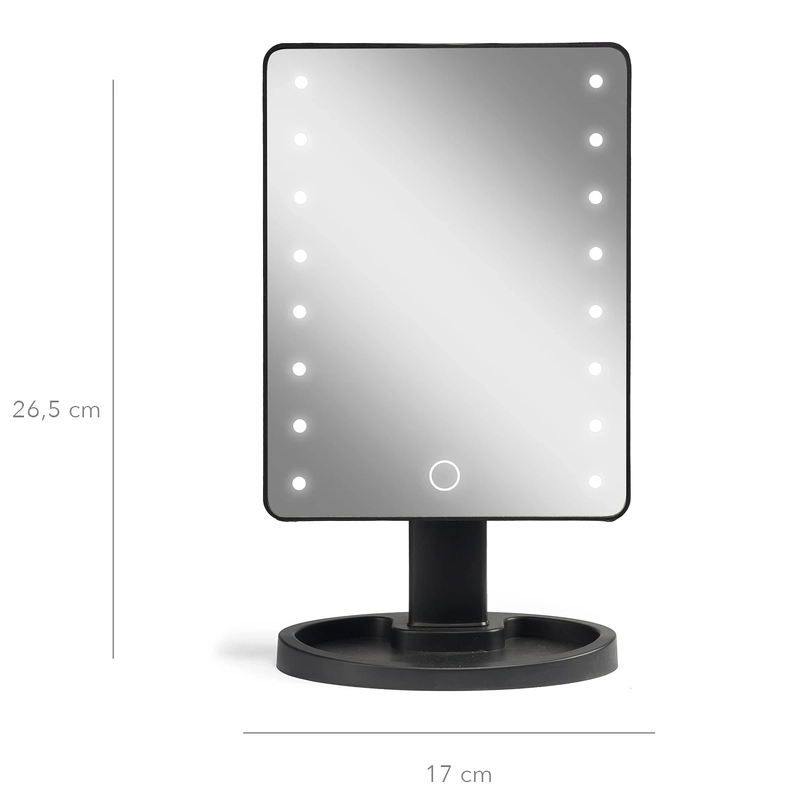 Spejlet er med touch-funktion, så det er let at tænde og slukke for lyset. Det kan også tiltes, så du nemt kan finde den optimale arbejdsvinkel. I spejlets fod er der desuden en lille bakke, som kan bruges til opbevaring af mindre genstande, som f.eks. hårnåle, smykker m.m.