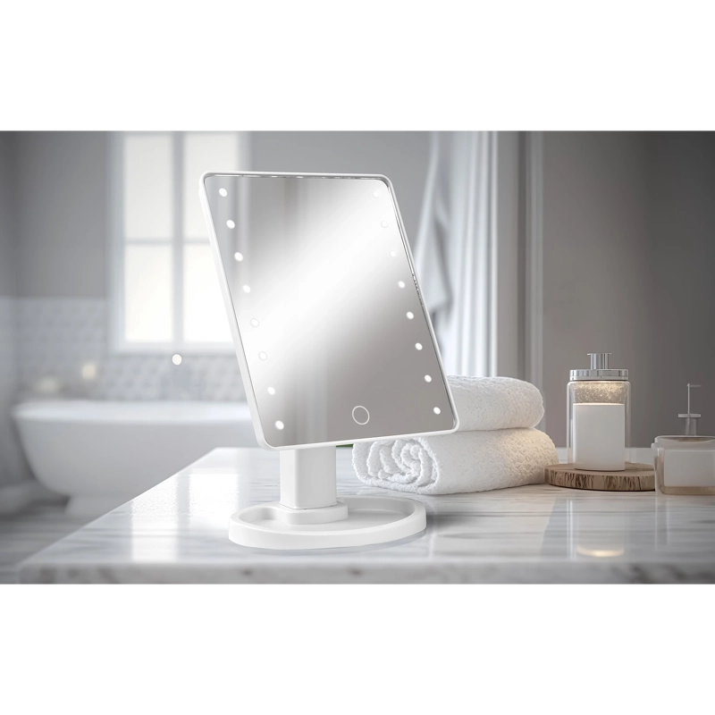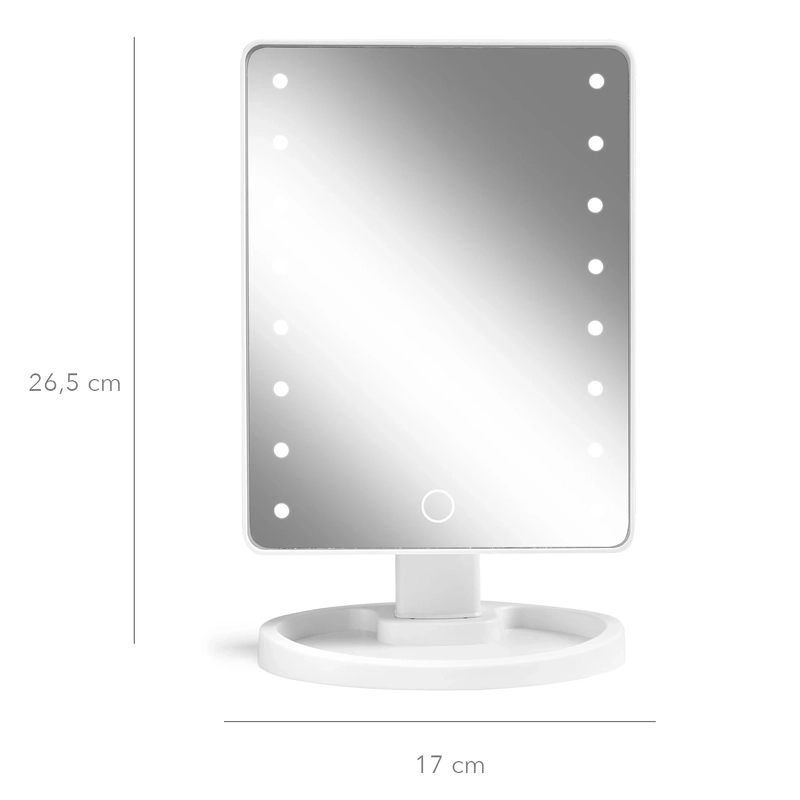 Spejlet er med touch-funktion, så det er let at tænde og slukke for lyset. Det kan også tiltes, så du nemt kan finde den optimale arbejdsvinkel. I spejlets fod er der desuden en lille bakke, som kan bruges til opbevaring af mindre genstande, som f.eks. hårnåle, smykker m.m.