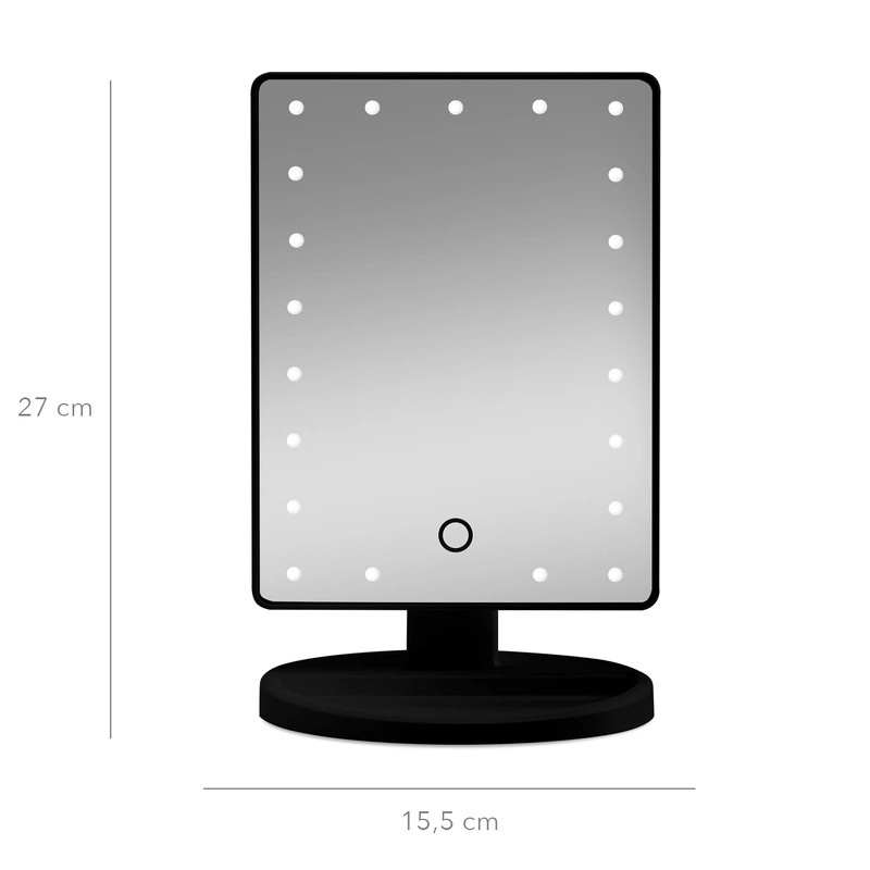Med sin størrelse er dette spejl både praktisk og stilfuldt, og det perfekte valg for kvinder i alle aldre. Spejlet bruger 4 x AA batterier (medfølger ikke).