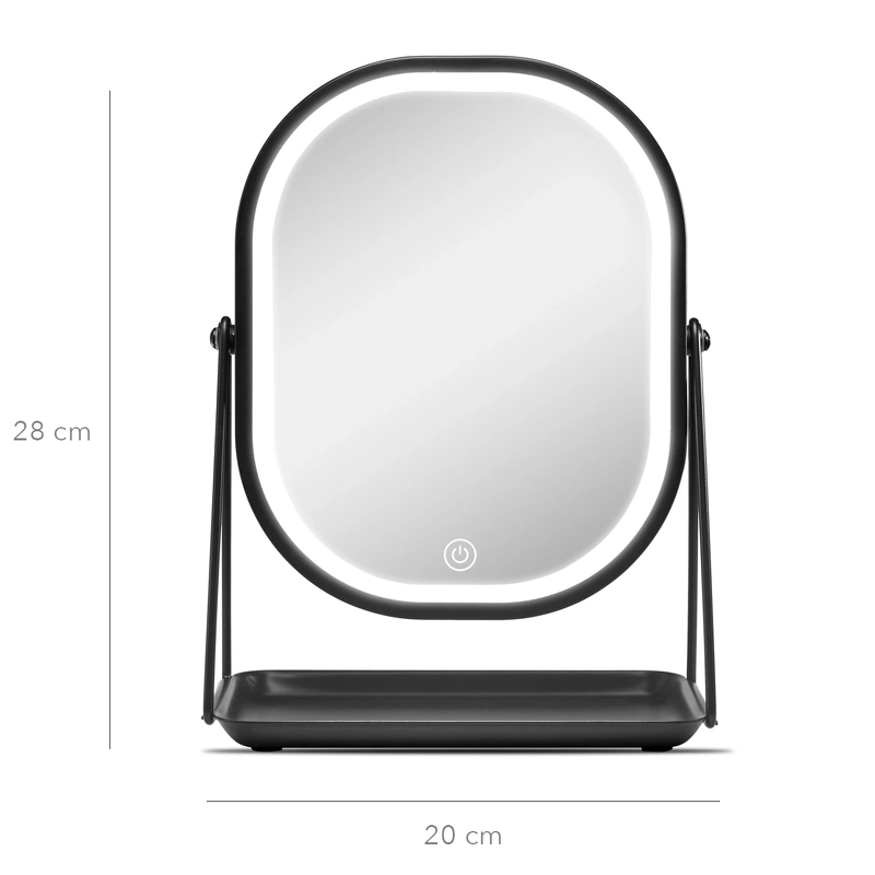 Spejlet er udstyret med kraftige LED-lys, så du nemt og præcist kan lægge din makeup, og med touch-knappen kan du justere lysstyrken efter behov. Bakken er ideel til opbevaring af smykker eller hårnåle, så du altid har dine accessories lige ved hånden.