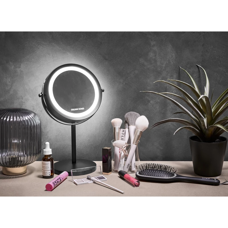 Gillian Jones Stand Light Mirror - Black er et super funktionelt og elegant makeupspejl, med LED-lyskilder (lysdioder). Makeupspejlet er dobbeltsidet med 1x forstørrelse på den ene side og 10x forstørrelse på den anden side, hvilket er med til at skabe de absolut bedste rammer for, at du kan lægge den helt perfekte makeup til både hverdag og fest.