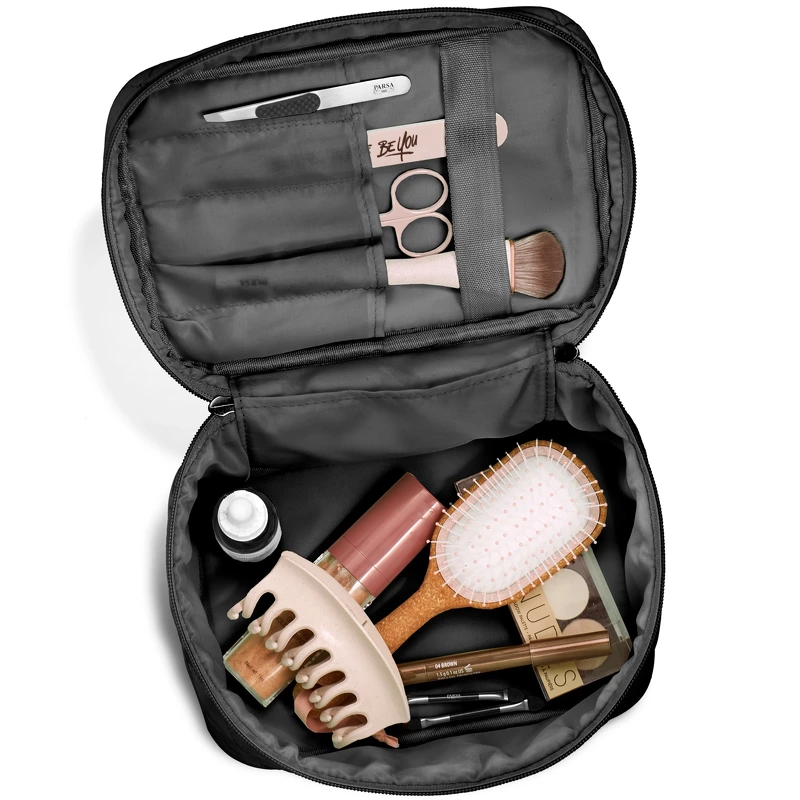 Denne rummelige beautyboks har 5 lommer og elastik i låget, så du nemt kan organisere og adskille dine makeuppensler og produkter. Med lynlås lukning og en praktisk hank, er den let at transportere, uanset om du er på farten eller derhjemme. Det lette nylonmateriale udvider sig efter behov, og kan nemt maskinvaskes ved 30 grader og tørretumbles ved lav varme. Med målene H14 x B23 x D16 cm, er der masser af plads til alle dine skønhedsfavoritter.