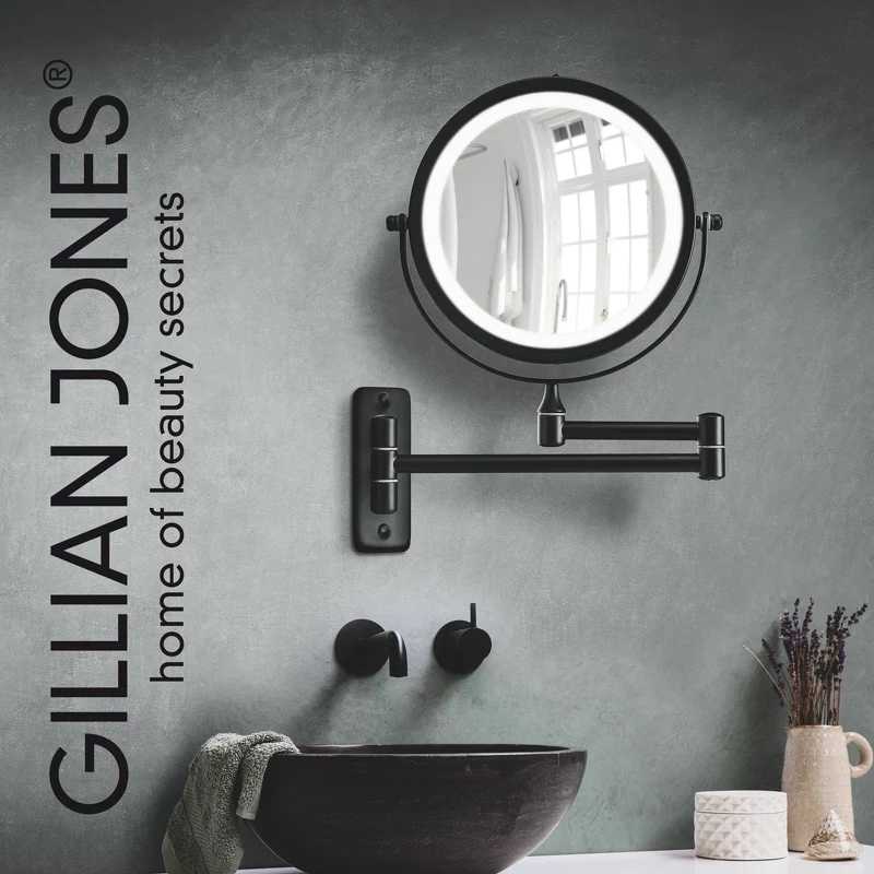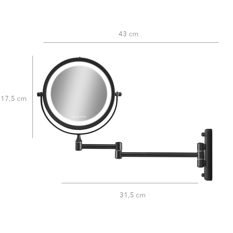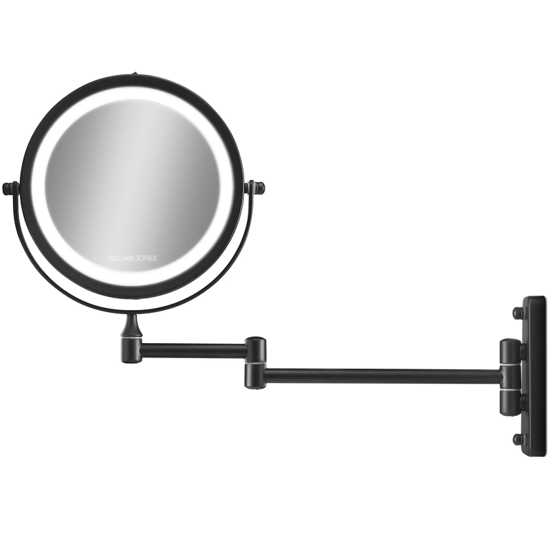 Gillian Jones Wall Mirror W/ Arm & Lights - Black er et super funktionelt og praktisk spejl, som er udviklet med et indbygget og rundt LED lys, for at give det bedst mulige spejlbillede. Spejlet er nemt at montere på væggen, og den indbyggede 'arm' gør så man kan trække spejlet op til 31 cm. ud, samt sætte det helt ind til væggen når man ikke bruger det.