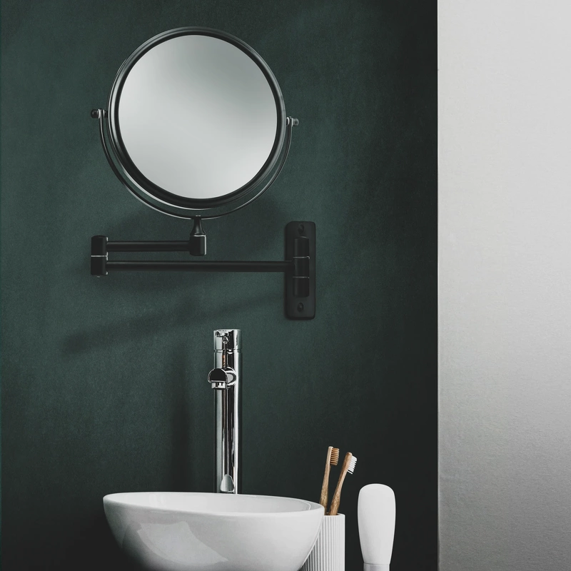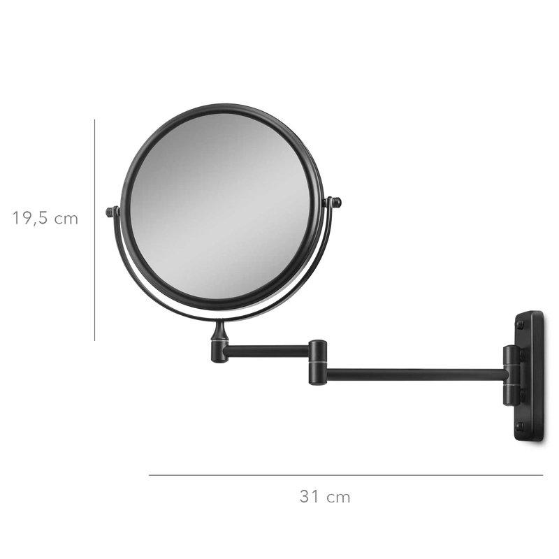 Gillian Jones Wall Mirror W/ Arm - Black er et super smart og effektivt spejl. Spejlet er nemt at montere på væggen, og den indbyggede 'arm' gør så man kan trække spejlet op til 31 cm ud, samt sætte det helt ind til væggen når man ikke bruger det.