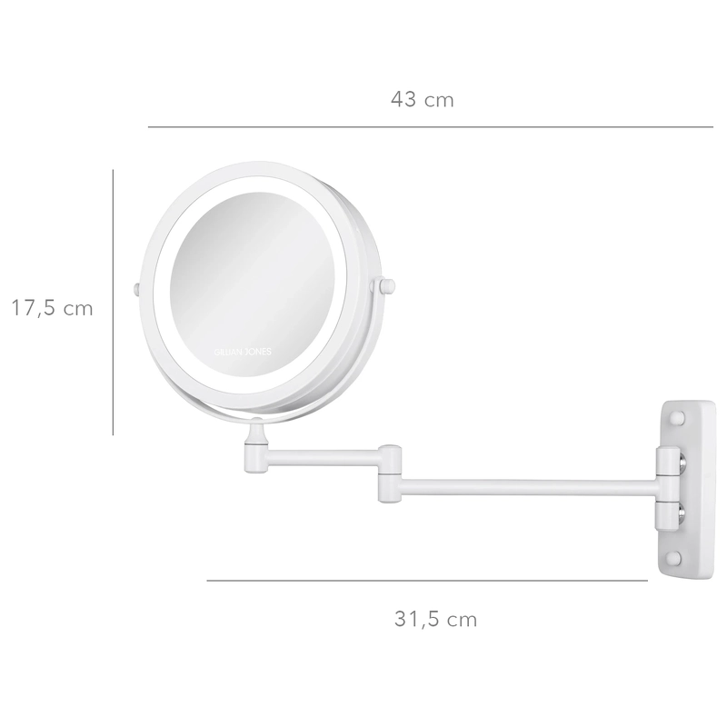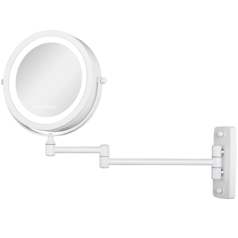 Gillian Jones Wall Mirror W/ Arm & Lights - White er et super funktionelt og praktisk spejl, som er udviklet med et indbygget og rundt LED lys, for at give det bedst mulige spejlbillede. Spejlet er nemt at montere på væggen, og den indbyggede 'arm' gør så man kan trække spejlet op til 31 cm. ud, samt sætte det helt ind til væggen når man ikke bruger det.