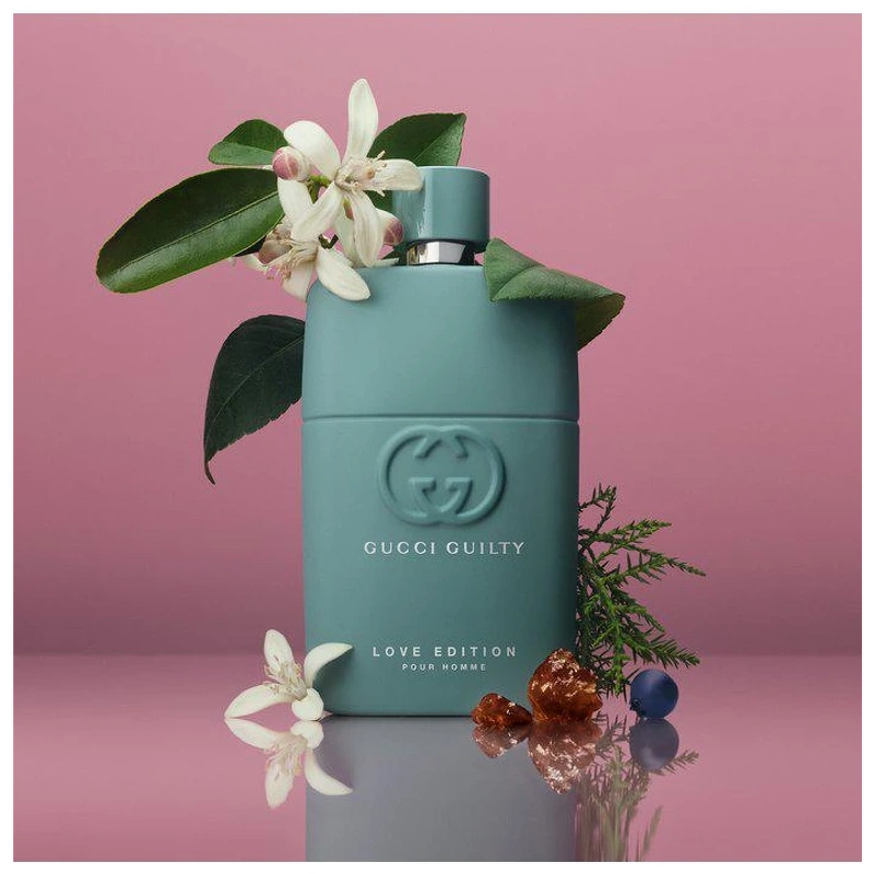 Gucci Guilty Love Edition Pour Homme åbner med forfriskende, maskuline noter af enebær, hvilket giver et balsamisk og krydret præg. Deres læderagtige og træagtige undertoner fletter sig sammen med en strålende hjertenote af appelsinblomst absolut, hvilket skaber en balanceret komposition fyldt med passion og sensualitet. Denne cremede, blomsternote, som både er frisk og rig, har en uimodståelig tiltrækningskraft. Duften afrundes med en træagtig, sensuel base af varm Ambrofix™ for en vedvarende aura af rav. Herreduftens flakon er i en mat turkis nuance, der repræsenterer den ene halvdel af kærlighedshistorien. Designet er prydet med husets klassiske GG-logo og en sølvbørstet duftprop.