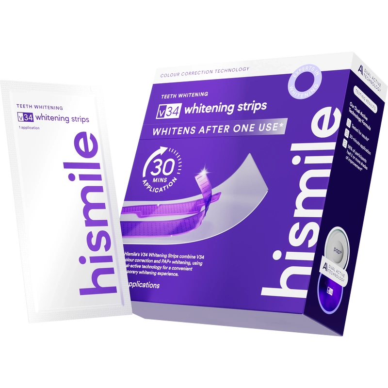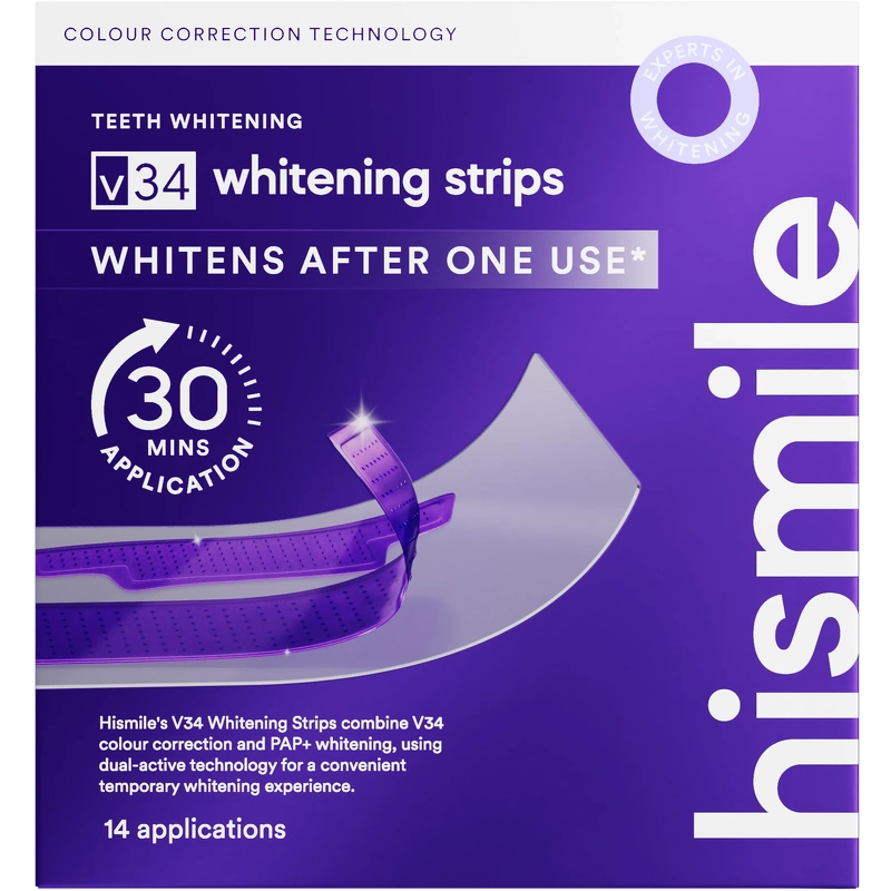 Hismile V34 Teeth Whitening Strips er tandblegningsstrips, som tilhører en ny generation af tandblegning, der forener innovation og resultater – og som samtidig er skånsom mod emaljen og fri for peroxid.