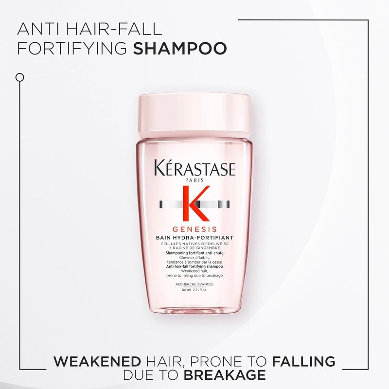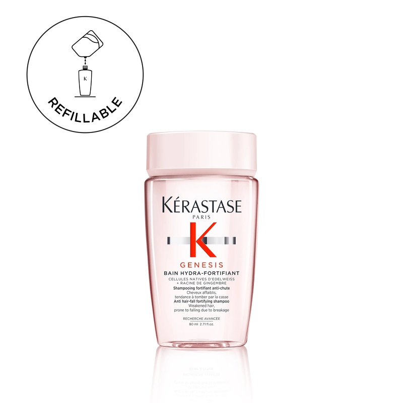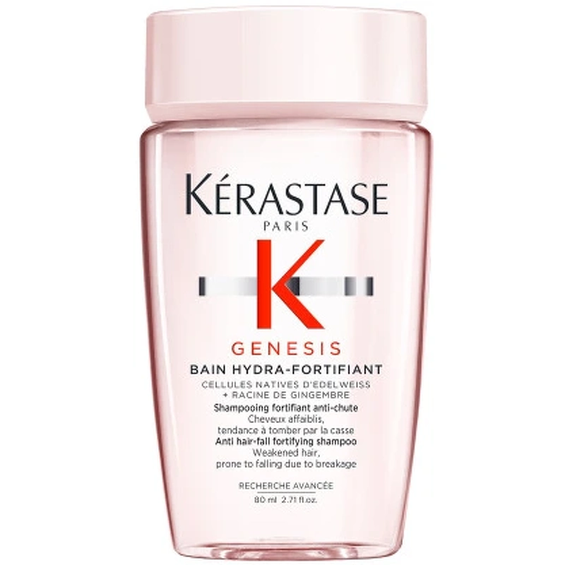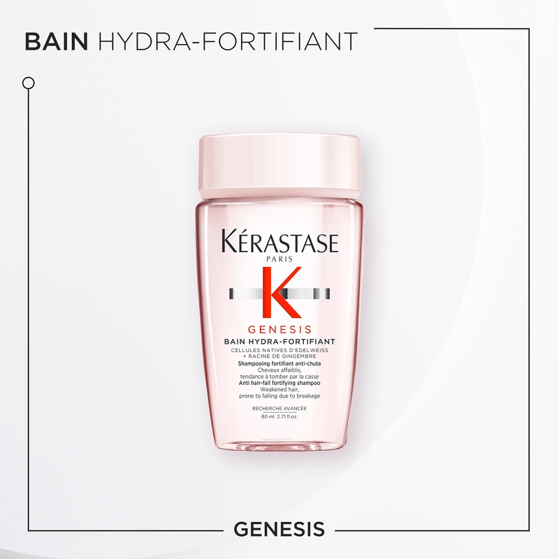 Den milde formel renser skånsomt, og fjerner effektivt fedt og forureningspartikler fra hovedbunden og hårfibrene. Kérastase Genesis Bain Hydra-Fortifiant Shampoo er beriget med en kombination af edelweiss og ingefærrod, som går ind og styrker hårfibrene, og derved gør dem modstandsdygtige overfor hårtab.