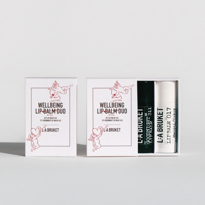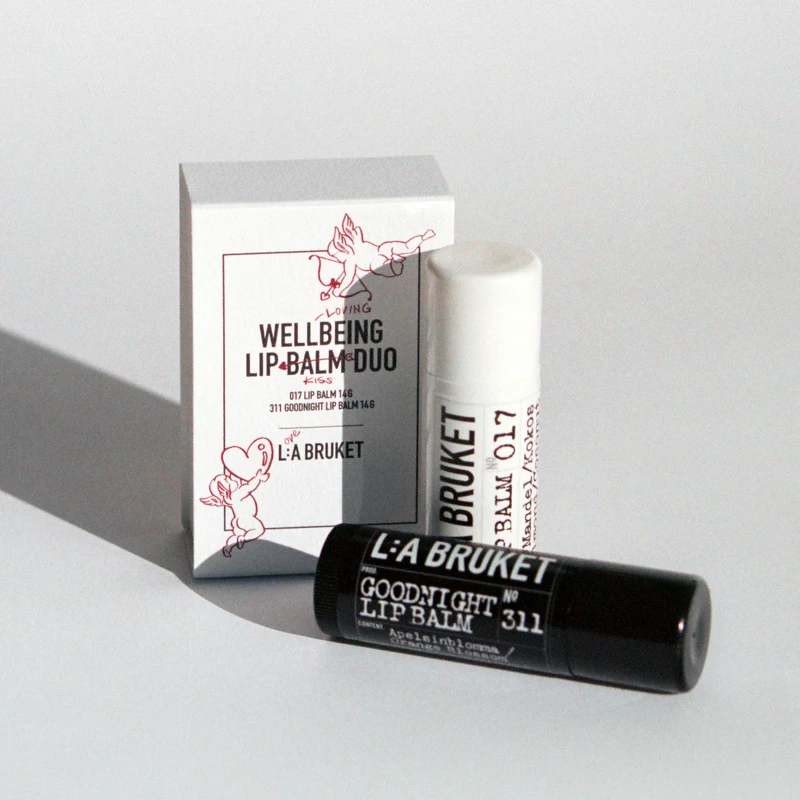 L:a Bruket Lip Duo Gift Set er et sæt til selvpleje med Original- og Goodnight-formlen. Du får en beroligende rutine, der fugter, blødgør og nærer læberne fra dag til nat.