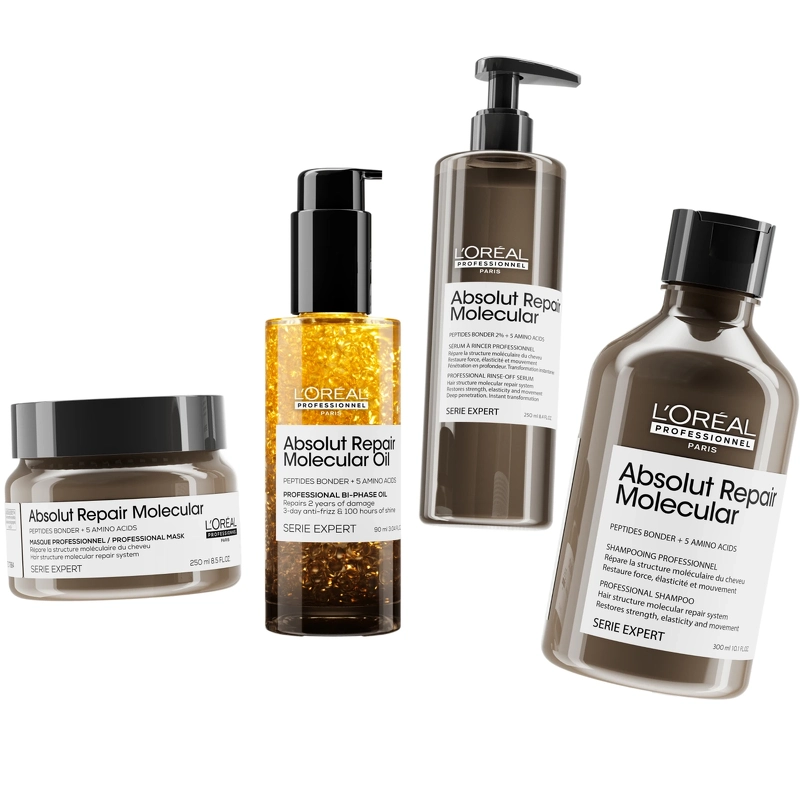 L'Oréal Professionnel Absolut Repair Molecular Bi-phase Oil er en koncentreret bi-faseolie til skadet hår, der reparerer 2 års skader i én brug og gør håret 97 % stærkere. Den giver 100 timers glans, gør håret 83 % glattere og giver tre dages frizz-kontrol uden at tynge.