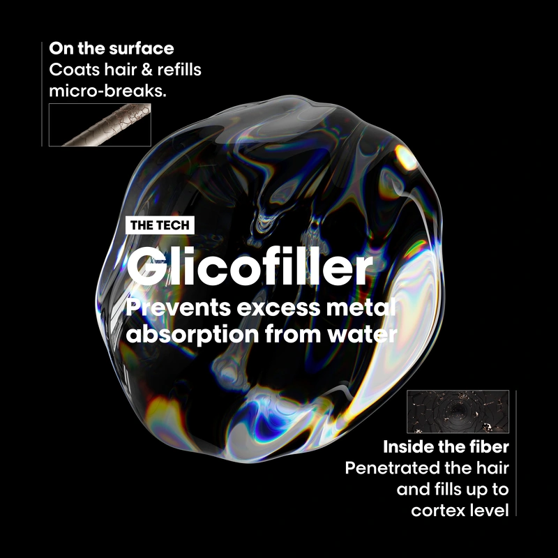 Vask efter vask kan metalpartikler som f.eks. kobber trænge ind i hårfibrene. Metalpartikler kan skabe en risiko for knækkede hår og farveskift. Denne pre-shampoo-behandling er koncentreret med glicofiller og genopfylder millioner af mikro-brud i håret i én brug. Skadet hår genforstærkes og beskyttes mod, at nye partikler deponeres for at reducere mængden af knækkede hår, samt giver 72 timers hydrering*.