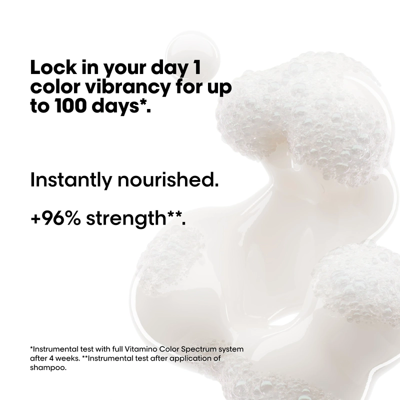 Vitamino Color Spectrum rutinen, formuleret med ferulsyre + citric acid, hjælper med at fastholde farven inde i hårfiberen for at bevare din hårfarves livlighed fra dag 1 i op til 100 dage. Denne ultra plejende shampoo, renser håret øjeblikkeligt og efterlader det næret, 96 % stærkere og 68 % blødere.