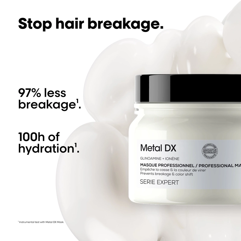 Metal DX-masken med Glicoamin dækker hårfiberen og beskytter den fra deponering af metalpartikler, mens den giver fugtighed. Hårfiberen bliver styrket, 97% færre knækkede hår,* håret bliver 2x gange mere glansfuldt, og farven holder længere.