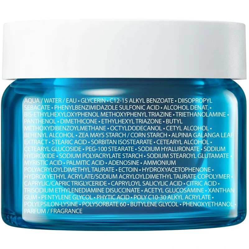 AQUA / WATER / EAU, GLYCERIN, C12-15 ALKYL BENZOATE, DIISOPROPYL SEBACATE, PHENYLBENZIMIDAZOLE SULFONIC ACID, ALCOHOL DENAT, BIS-ETHYLHEXYLOXYPHENOL METHOXYPHENYL TRIAZINE, TRIETHANOLAMINE, PANTHENOL, DIMETHICONE, ETHYLHEXYL TRIAZONE, BUTYL METHOXYDIBENZOYLMETHANE, OCTYLDODECANOL, CETYL ALCOHOL, BEHENYL ALCOHOL, ZEA MAYS STARCH / CORN STARCH, ALPINIA GALANGA LEAF EXTRACT, STEARIC ACID, SORBITAN ISOSTEARATE, CETEARYL ALCOHOL, CETEARYL GLUCOSIDE, PEG-100 STEARATE, SODIUM HYALURONATE, SODIUM HYDROXIDE, SODIUM POLYACRYLATE STARCH, SODIUM STEAROYL GLUTAMATE, MYRISTIC ACID, PALMITIC ACID, ADENOSINE, AMMONIUM POLYACRYLOYLDIMETHYL TAURATE, ECTOIN, HYDROXYACETOPHENONE, HYDROXYETHYL ACRYLATE/SODIUM ACRYLOYLDIMETHYL TAURATE COPOLYMER, CAPRYLIC/CAPRIC TRIGLYCERIDE, CAPRYLOYL SALICYLIC ACID, CITRIC ACID, TRISODIUM ETHYLENEDIAMINE DISUCCINATE, ACETYL GLUCOSAMINE, XANTHAN GUM, PENTYLENE GLYCOL, PHYTIC ACID, POLY C10-30 ALKYL ACRYLATE, POLYEPSILON-LYSINE, POLYSORBATE 60, BUTYLENE GLYCOL, PHENOXYETHANOL, PARFUM / FRAGRANCE (F.I.L. N70056914/1).