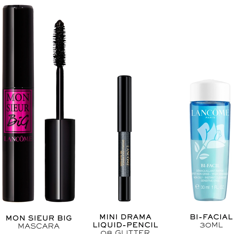 Monsieur Big Mascara i fuld størrelse giver op til 12x mere volumen med sin opbyggelige, klumpfri formel og bølgede fiberbørster, som omslutter hver vippe jævnt for en fyldig, ultrasort og dramatisk effekt. Mini-Drama Liqui-Pencil tilføjer præcis, ultra-pigmenteret definition, så du kan skabe et intenst øjenudsagn med ét enkelt strøg. Bi-Facil Makeup Remover fjerner effektivt al makeup, inklusive vandfaste formler, og efterlader vipperne rene, friske og velplejede.