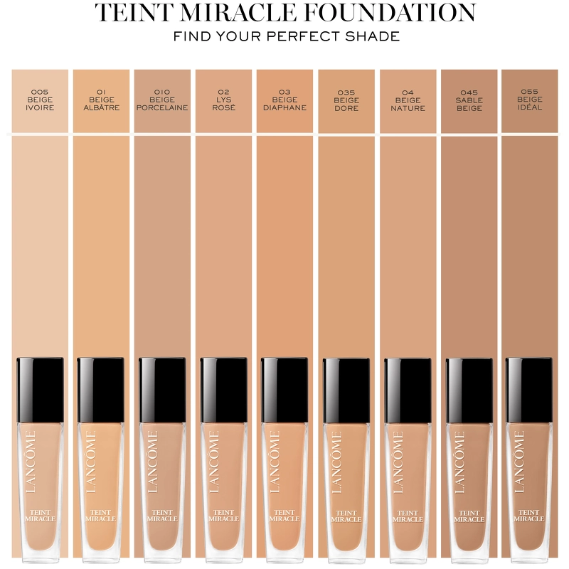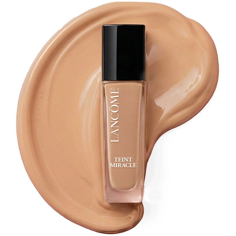 Lancôme Teint Miracle Foundation er en foundation, der gør din hud strålende og lysende. Den lette, semi-dækkende foundation udjævner hudtonen og får huden til at se naturligt frisk og smuk ud. Teint Miracle foundation fugter huden og hjælper med at holde den blød hele dagen. Der er 9 forskellige nuancer, hvilket gør det nemt at finde en foundationfarve, der passer perfekt til din egen hud. Vær opmærksom på, at nuancerne kan se anderledes ud i flasken. På grund af iltning ved påføring vil farven ændre sig til den 'rette' nuance få minutter efter, at den er lagt på huden. Dette gælder for alle nuancer.