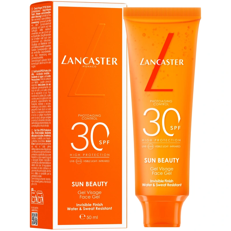 Lancaster Sun Beauty Face Gel SPF 30 er en let, transparent gel, der beskytter huden mod fotoaldring og giver en frisk, mat finish. Med Full Light Technology™ får huden 10x bredere beskyttelse mod solens stråler* – ikke kun mod UVA og UVB, men også mod synligt lys og infrarød stråling. Formlen indeholder også Sun Repair System, som hjælper med at reparere solskader og styrke hudens modstandskraft.