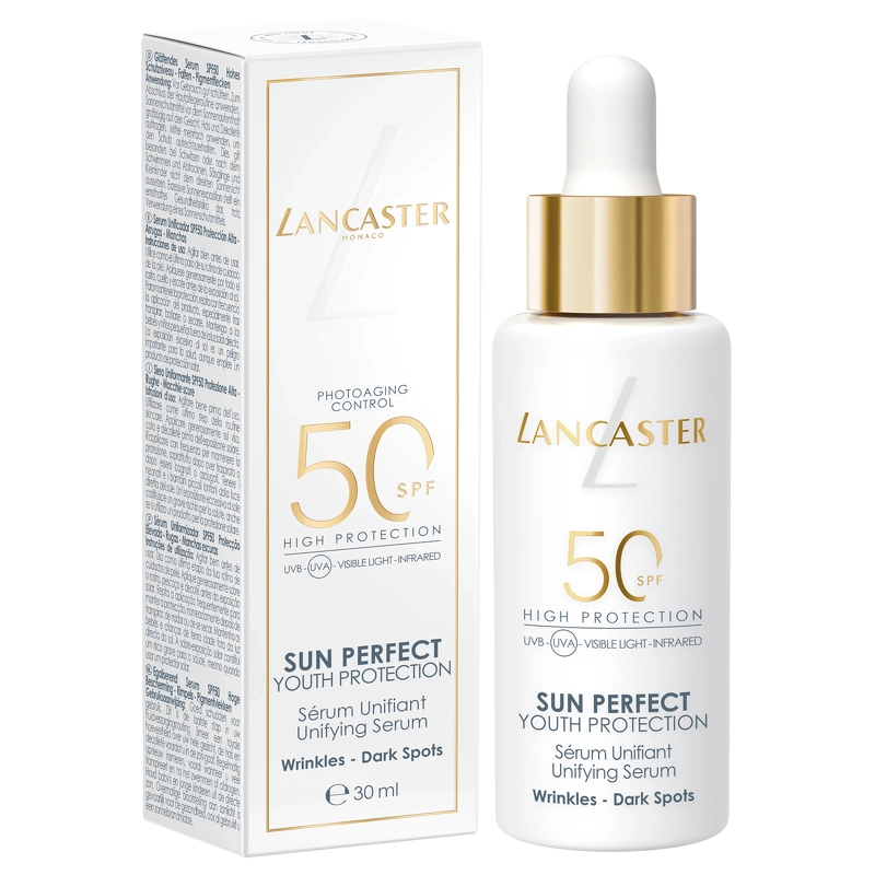 Lancaster Sun Perfect Unifying Serum SPF 50 er et højteknologisk, ultralet serum, der giver Lancasters mest avancerede beskyttelse mod fotoaldring – samtidig med at hudens udseende forbedres dag for dag. Med Full Light Technology™ og Sun Repair System beskyttes huden mod 100 % af solens spektrum* og hjælper med at reparere solskader. Beriget med C-vitamin og niacinamid arbejder serummet effektivt mod mørke pletter, rynker og ujævn hudtone.