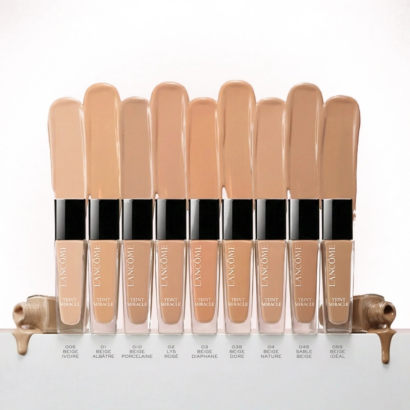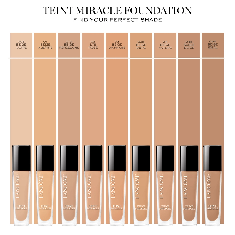 Lancôme Teint Miracle Foundation er en foundation, der gør din hud strålende og lysende. Den lette, semi-dækkende foundation udjævner hudtonen og får huden til at se naturligt frisk og smuk ud. Teint Miracle foundation fugter huden og hjælper med at holde den blød hele dagen. Der er 9 forskellige nuancer, hvilket gør det nemt at finde en foundationfarve, der passer perfekt til din egen hud. Vær opmærksom på, at nuancerne kan se anderledes ud i flasken. På grund af iltning ved påføring vil farven ændre sig til den 'rette' nuance få minutter efter, at den er lagt på huden. Dette gælder for alle nuancer.