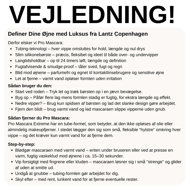 Find mere fra dette mærke:Lantz Cph Pro Mascara Extreme - Brown 10 er en brun mascara, som er skabt til dig, der ønsker maksimal længde, præcis adskillelse og et åbent, løftet blik – uden drama, drys eller pandaøjne. Den avancerede tubing-teknologi omslutter hver enkelt vippe og giver både hold, længde og et resultat uden drys. Den slanke silikonebørste er fleksibel og præcis, hvilket gør den ideel til både over- og undervipper. Mascaraen giver op til 24 timers løft, længde og definition, samtidig med at den er fugtafvisende og smudge-proof – perfekt til sved, fugt og regn. Formlen er parfumefri, skånsom mod øjnene og velegnet til både sensitive øjne og kontaktlinsebrugere.