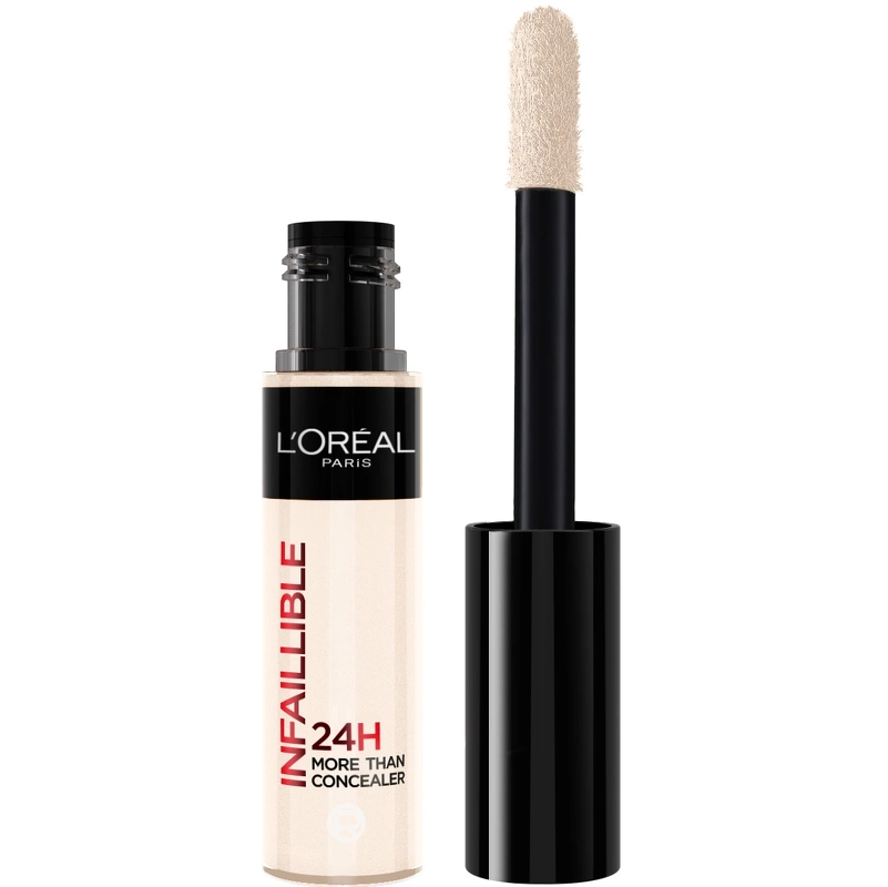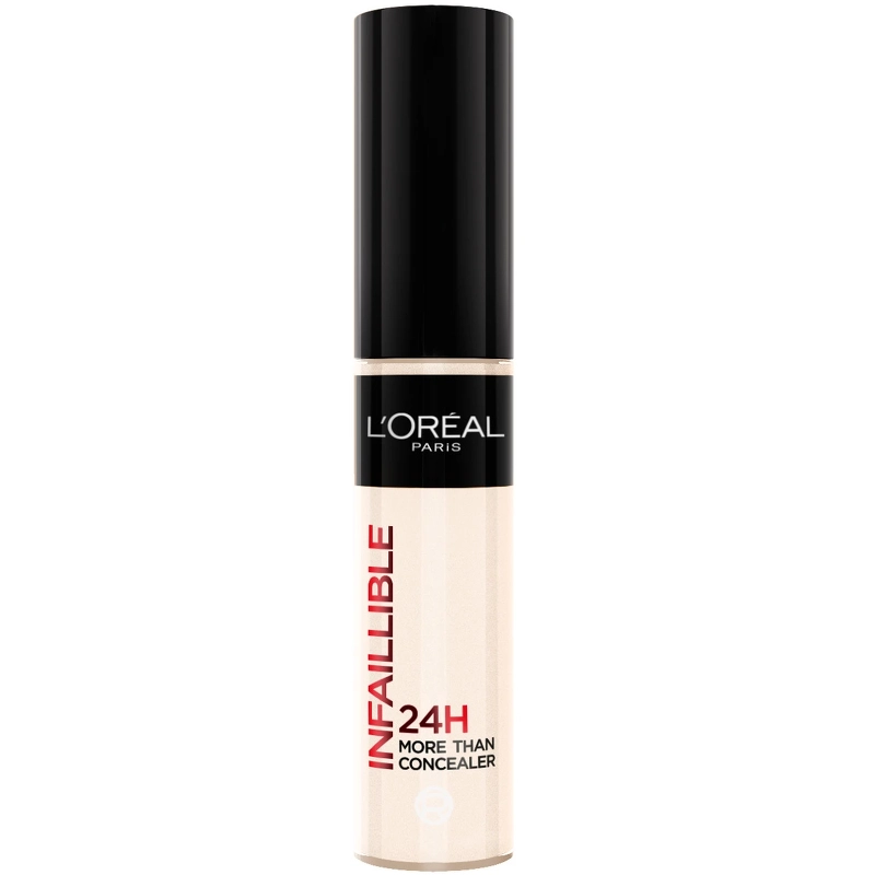 L'Oréal Paris Cosmetics Infaillible More Than Concealer - 320 Cool har en ekstra høj dækkeevne, så den dækker selv de mørkeste rande under øjnene. Denne concealer er udviklet med et ekstra stort applikatorhoved, hvilket gør den ideel til contouring, dækning af urenheder og sågar som foundation. Trods den høje dækkeevne føles den let og silkeblød på huden i op til 24 timer.