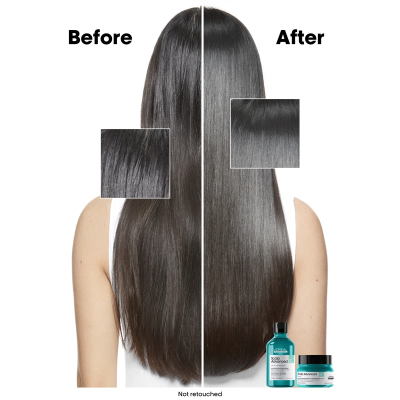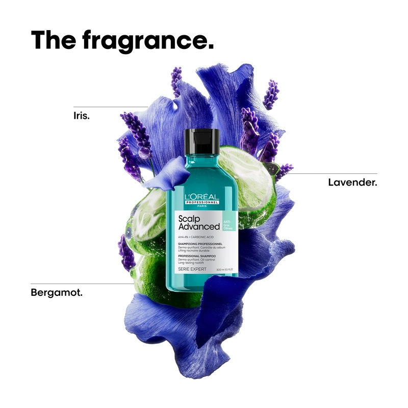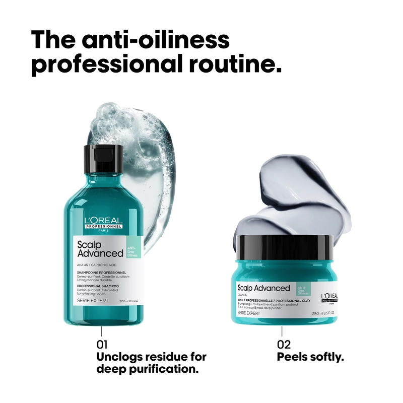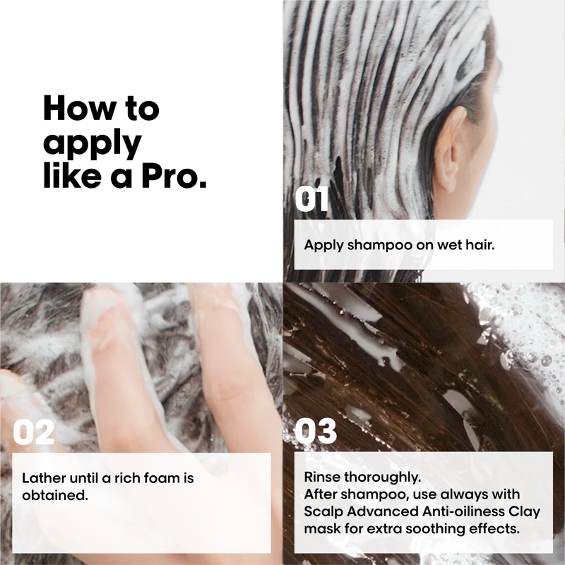 L'Oréal Professionnel Scalp Advanced Anti-Oiliness Shampoo er sammensat til olieret hovedbund. Denne letvægtsgelé renser hovedbunden og hårfiberen for synlige produktrester, sved og olie for en friskere og renere følelse.