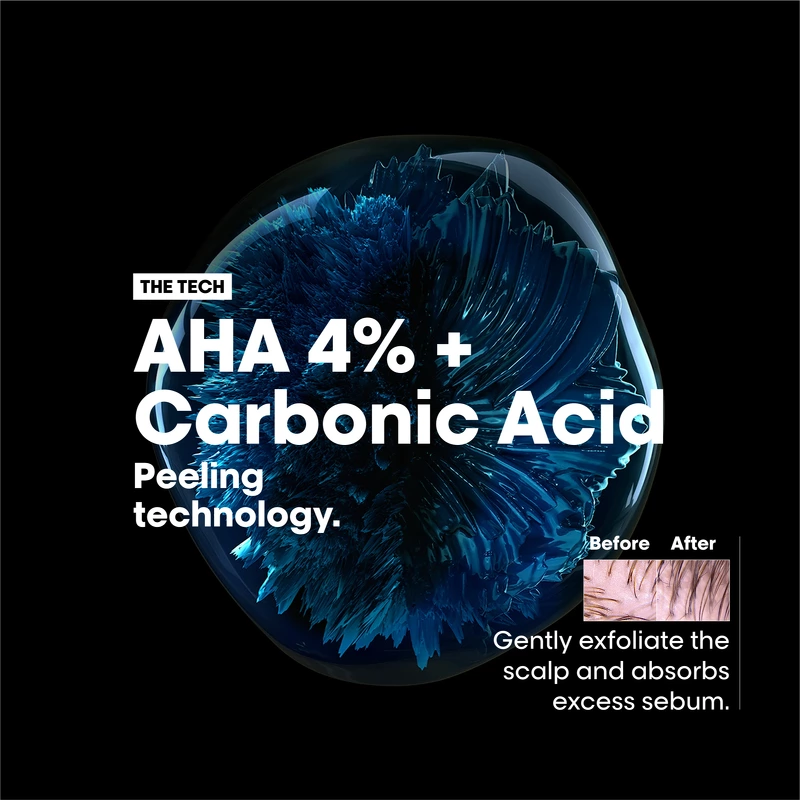 Professionel peel-teknologi i en ultralet gelé sammensat med 4 % AHA og kulsyre til at eksfoliere hovedbunden og absorbere overskyldende talg for langvarig løft af bunden.