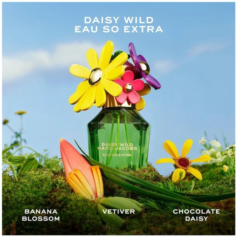 Marc Jacobs Daisy Wild Eau So Extra EDP omfavner naturens utæmmede skønhed – en duft lige så fri og livlig som en buket af vilde blomster. Kompositionen er uforudsigelig og indbydende med cremede noter af blå banan og saftig pærenektar, smukt flettet sammen med chokoladeblomst, en ægte blomst med karakteristiske, chokoladeduftende facetter. I hjertet blomstrer jasmin sambac og appelsinblomst, mens basens varme noter af vanilje, rav, sandeltræ og en trio af vetiver tilfører sensuel dybde. Marc Jacobs Daisy Wild Eau So Extra – en feminin floral gourmand duft, som indfanger nostalgiens sødme og spændingen ved det uventede.
