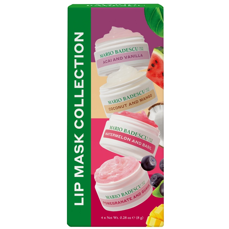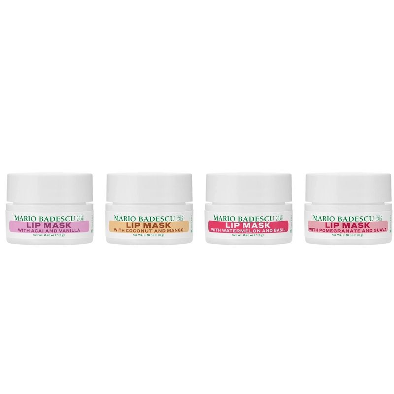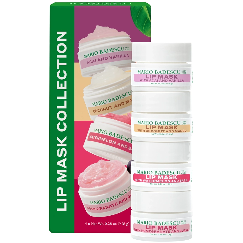 Mario Badescu Lip Mask Collection er en pakke med 4 næringsrige natmaske til læberne, som er beriget med eksotiske tropiske planteekstrakter og plejende olier, der giver intensiv fugt og efterlader læberne bløde, glatte og strålende. Perfekt til at revitalisere tørre læber og give dem en sund, uimodståelig glød – fordi dine læber fortjener det bedste, hver dag og nat.