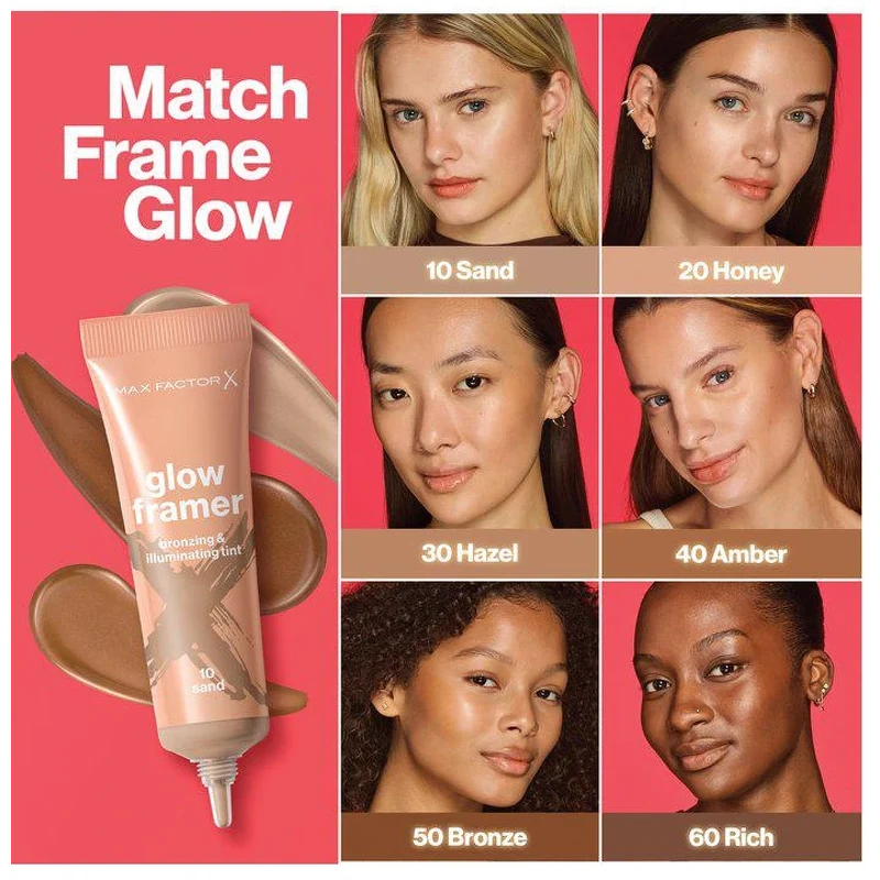Max Factor Glow Framer Skin Tint er en glødgivende skin tint, der fremhæver og definerer dine naturlige ansigtstræk. Den vægtløse formel med let shimmer og bronzing-pigment smelter ind i huden og giver en jævn finish med naturlig glød. Afhængigt af nuancen kan den bruges som bronzer, highlighter eller all-over tint for et friskt, strålende udseende. Glow Framer gør det nemt at skabe dimension og glød – uden flere trin eller avancerede teknikker. Brug den under eller over makeup for at fremhæve ansigtstrækkene og tilføre glow, eller alene for et naturligt, strålende look.