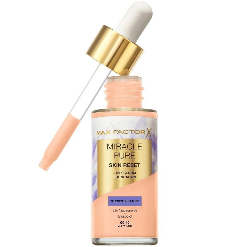 Max Factor Miracle Pure 2in1 Skin Reset Serum Foundation er en 2-i-1 serumformel kombineret med foundation, der giver en øjeblikkelig dækning, og en mere jævn hudtone.