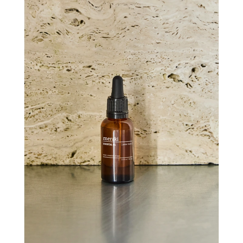 Meraki Essential Oil - Amber Dust er en æterisk olie med en fyldig duftblanding af krydret allehånde, figen og rav på en base af trænoter, som er velegnet til brug i diffusere, duftlamper og saunaer.