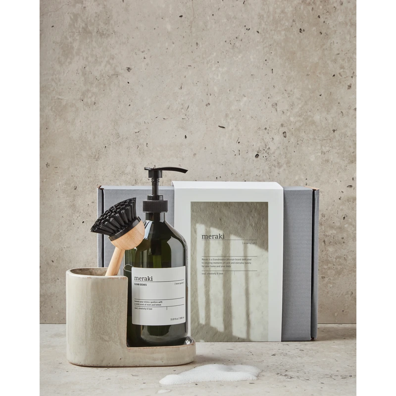 Opvaskesæben har en skøn duft af blomster, er mild mod huden og effektiv mod snavs, samt fyldt i en enkelt og stilfuld beholder med praktisk pumpe for nem dosering. Børsten er designet med slidstærkt og bæredygtigt bambushåndtag og udskifteligt børstehoved. Holderen er fremstillet af ler med en grålig glasur og gør opbevaring af opvaskesæbe og -børste både stilfuld, enkel og praktisk.