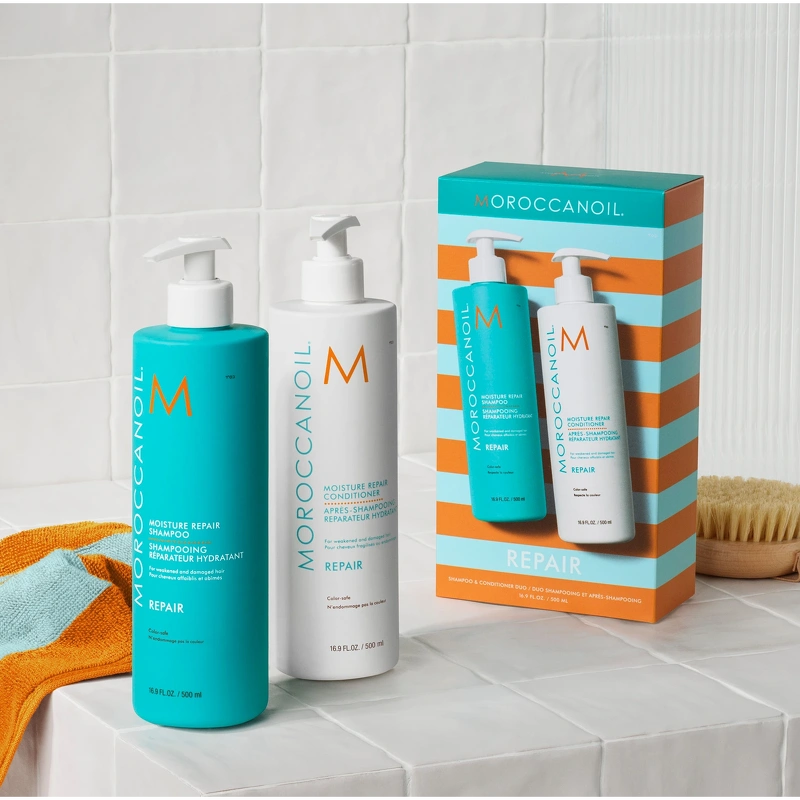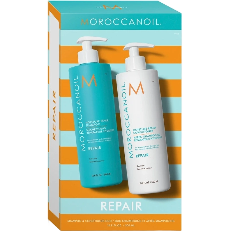 Moroccanoil Repair Duo Box er en lækker boks bestående af Moisture Repair shampoo 500 ml og Moisture Repair conditioner 500 ml. Den perfekte duo til dig med svækket eller beskadiget hår.