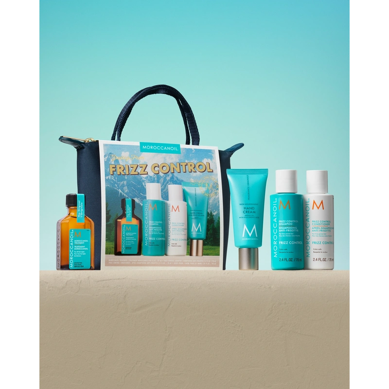 Tasken indeholder en Frizz Control Shampoo og en Frizz Control Conditioner, som reducerer frizz og forbedrer hårets håndterbarhed, samt en Moroccanoil Treatment Regular, der giver håret masser af pleje og glans og efterlader det silkeblødt. Derudover indeholder tasken også en Moroccanoil Hand Cream “Fragrance Originale”, som intensivt plejer både hænder, neglebånd og negle.