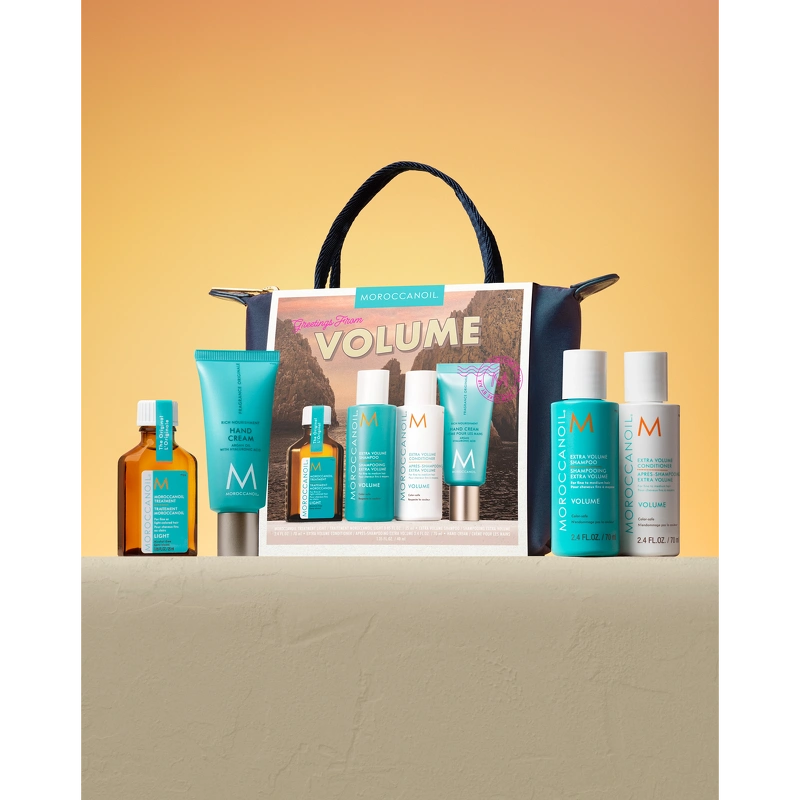 Volume Travel Bag er perfekt til dig med fint hår, som ønsker mere fylde. Tasken indeholder en Extra Volume Shampoo og en Extra Volume Conditioner, som tilfører fylde og volumen til håret, samt en Moroccanoil Treatment Light, der giver håret masser af pleje og glans og efterlader det silkeblødt uden at tynge. Derudover indeholder tasken også en Moroccanoil Hand Cream “Fragrance Originale”, som intensivt plejer både hænder, neglebånd og negle.
