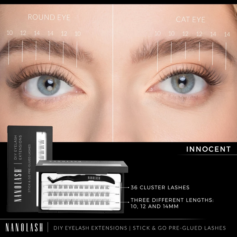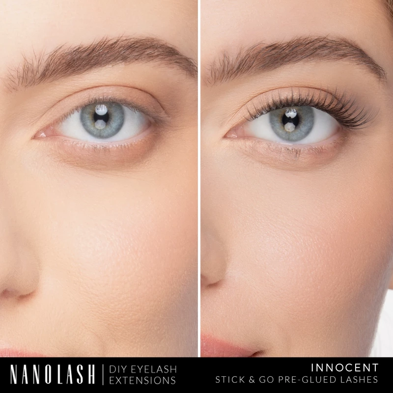Nanolash DIY Eyelash Extensions Stick & Go Pre-glued Lashes er selvklæbende vipper, som er den perfekte løsning for dem, der sætter pris på nem og hurtig brug. Takket være deres fleksible, pres-resistente struktur, bevarer de deres oprindelige facon under brugen. Vipperne placeres i meget tynde, fleksible bånd, der er dækket med et gennemsigtigt selvklæbende lag, som sikrer hurtig påføring uden behov for yderligere produkter. Når først vipperne er påført under de naturlige vipper, er sammenføjningen usynlig, så man får et naturligt fyldigt look.