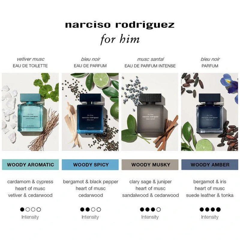 Topnoter af salvie og enebær åbner duften med et rent pust af friskhed. I hjertet afslører den ikoniske Narciso Rodriguez musc-signatur sin kraftfulde karakter, som udsender uimodståelig tiltrækning. Varme noter af cedertræ og sandeltræ tilføjer en kontrasterende træagtig dybde i basen. En flygtig duft fyldt med harmonisk spænding.
