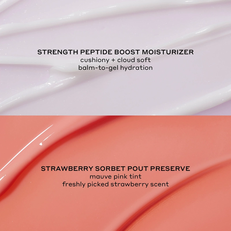 Fyld og fugt din hud og læber med denne mini-duo. Disse bestsellere er baseret på peptider og giver en fastere, mere elastisk hud og fyldigere læber på bare 1 uge**. Strength Moisturizer er en ceramidforstærket daglig essens, der styrker, synligt forbedrer udseendet af fine linjer og rynker og styrker hudbarrieren hele dagen. Strawberry Sorbet Pout Preserve Peptide Lip Treatment plejer læberne med kokumsmør for at give fyldig fugtighed i en mauve farve og duft af friskplukkede jordbær.