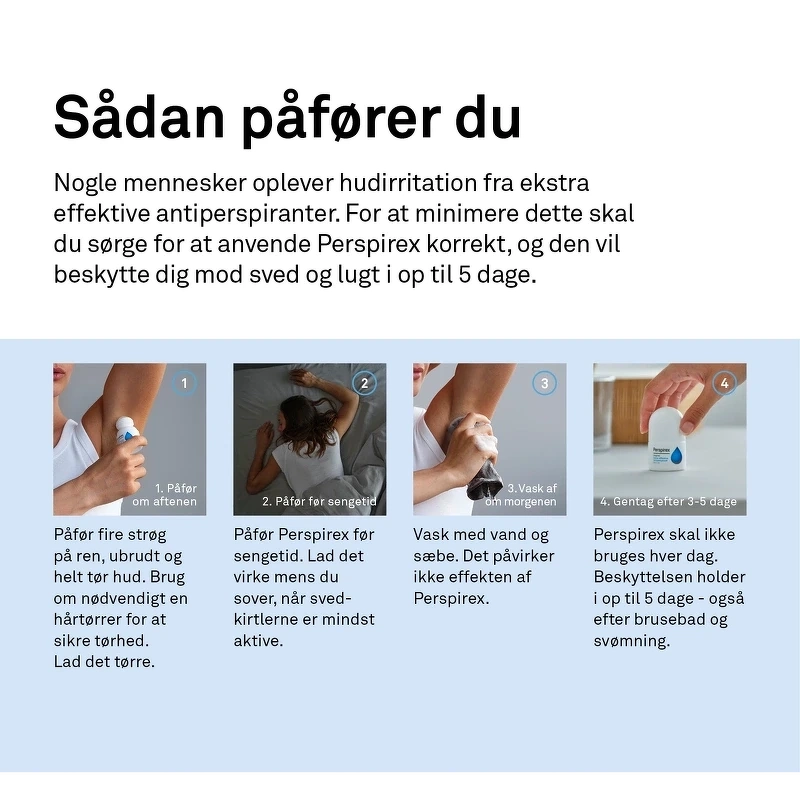 BEMÆRK VENLIGST: Anvend aldrig Perspirex på beskadiget/ødelagt eller irriteret hud. Brug ikke Perspirex i 48 timer efter nogen form for hårfjerning. Kun til udvendig/ekstern brug. Undgå kontakt med øjne og andre slimhinder. I sjældne tilfælde kan Perspirex forårsage hudirritation eller en allergisk hudreaktion. Hvis dette sker, bør behandlingen afbrydes/annulleres. Må ikke anvendes på børn. Kraftig svedtendens forekommer sjældent før puberteten. Perspirex kan misfarve eller mørkne/ødelægge det tøj, du har på om natten efter brug. Undgå kontakt med smykker og andre polerede metaloverflader. Sørg for at stramme/sikre låget/coveret efter brug for at undgå lækage/spild. Opbevares ved stuetemperatur. FORSIGTIG: Brændende fornemmelse og kløe kan opstå, hvis: Huden ikke er helt tør og ubeskadiget før påføring, du ikke lader Perspirex tørre helt efter påføring, du påfører for meget Perspirex.