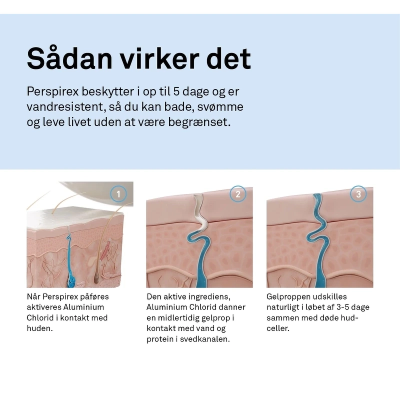 BEMÆRK VENLIGST: Anvend aldrig Perspirex på beskadiget/ødelagt eller irriteret hud. Brug ikke Perspirex i 48 timer efter nogen form for hårfjerning. Kun til udvendig/ekstern brug. Undgå kontakt med øjne og andre slimhinder. I sjældne tilfælde kan Perspirex forårsage hudirritation eller en allergisk hudreaktion. Hvis dette sker, bør behandlingen afbrydes/annulleres. Må ikke anvendes på børn. Kraftig svedtendens forekommer sjældent før puberteten. Perspirex kan misfarve eller mørkne/ødelægge det tøj, du har på om natten efter brug. Undgå kontakt med smykker og andre polerede metaloverflader. Sørg for at stramme/sikre låget/coveret efter brug for at undgå lækage/spild. Opbevares ved stuetemperatur. FORSIGTIG: Brændende fornemmelse og kløe kan opstå, hvis: Huden ikke er helt tør og ubeskadiget før påføring, du ikke lader Perspirex tørre helt efter påføring, du påfører for meget Perspirex.