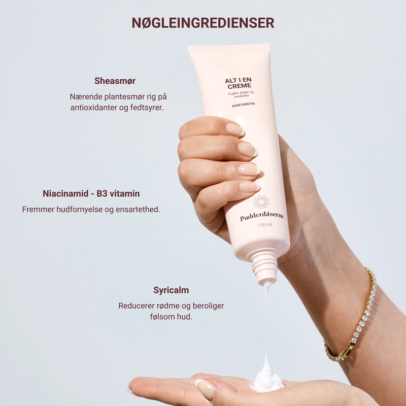 Pudderdåserne All In One Cream kan bruges på alle de tider af døgnet, hvor du føler, at huden bliver tør eller irriteret. Derudover er den uden parfume, så du med god samvittighed kan bruge den på daglig basis.