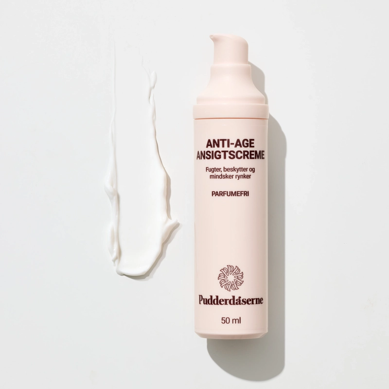 Pudderdåserne Anti-Age Ansigtscreme er en fugtgivende creme, som måske nærmere burde betegnes som et serum. Formlen er beriget med peptider, B3-vitamin og hyaluronsyre, så både arbejder på at give huden fugt og på at reducere fine linjer og rynker.