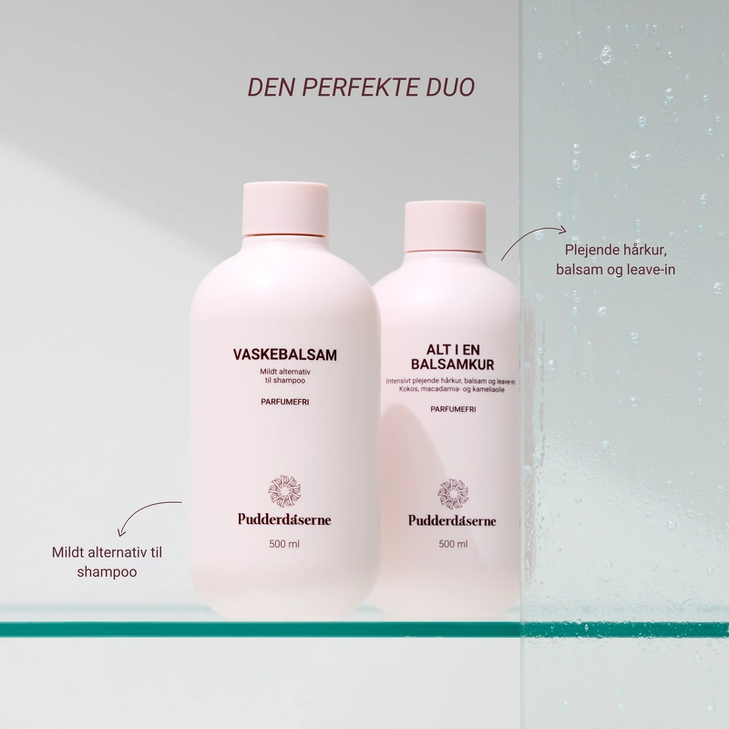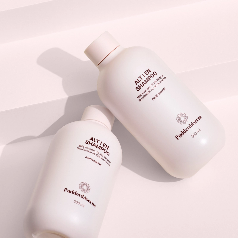 Pudderdåserne Alt I En Shampoo er en skånsom og uparfumeret shampoo, som kan bruges af alle og til alle hårtyper. Den indeholder blandt andet et vaskeaktiv, kaldet sodium coco-sulfat, som er et mildere alternativ til de traditionelt anvendte sulfater.