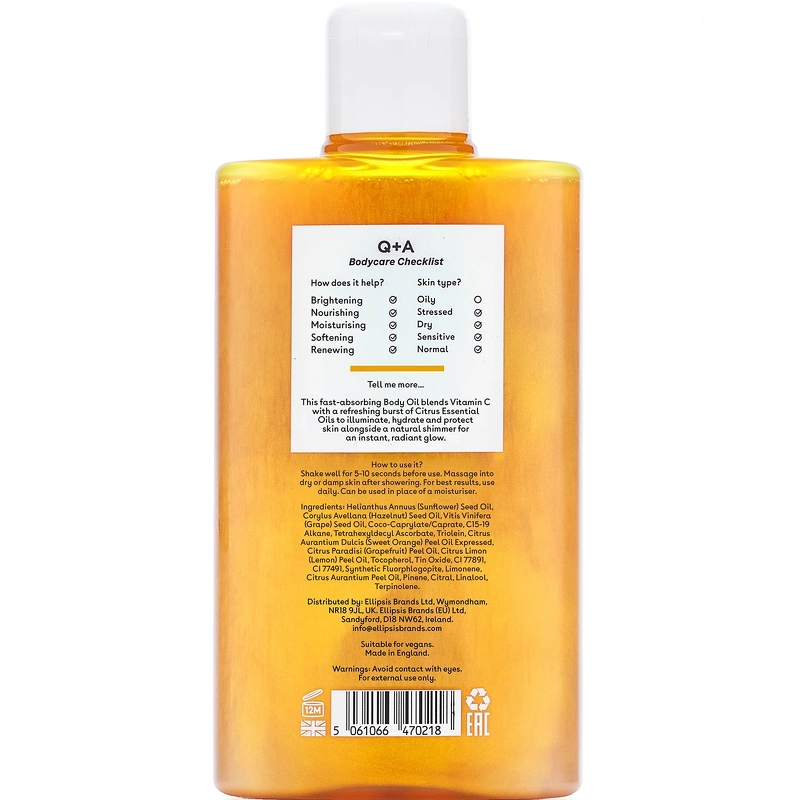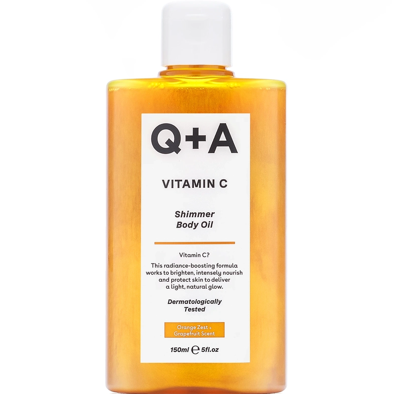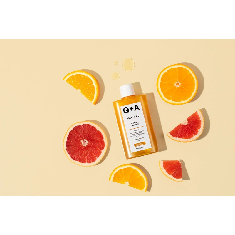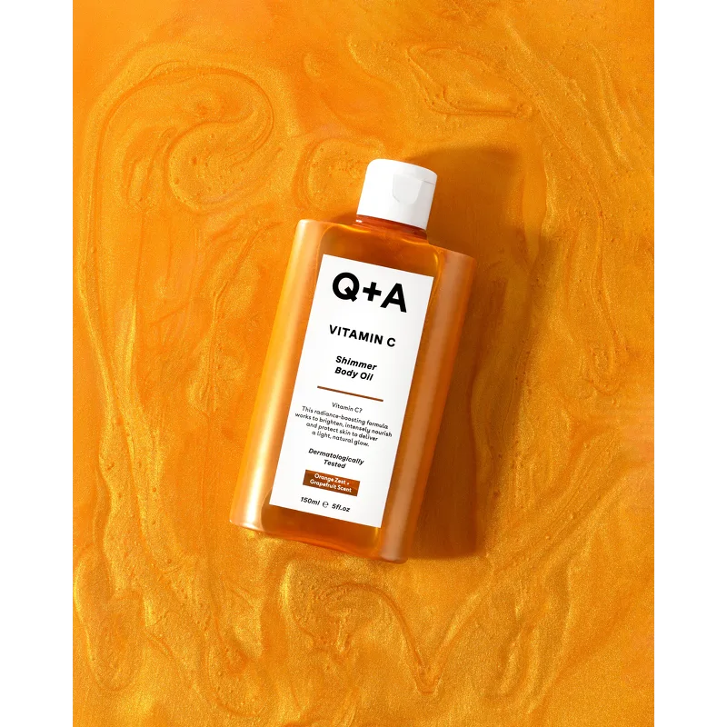 Q+A Vitamin C Shimmer Body Oil er en nærende kropsolie, der fugter og efterlader huden med en subtil, lysreflekterende glød med en solkysset finish. Formuleret med udglattende C-vitamin, nærende hasselnøddeolie og naturlig shimmer for silkeblød hud med en sund glød.