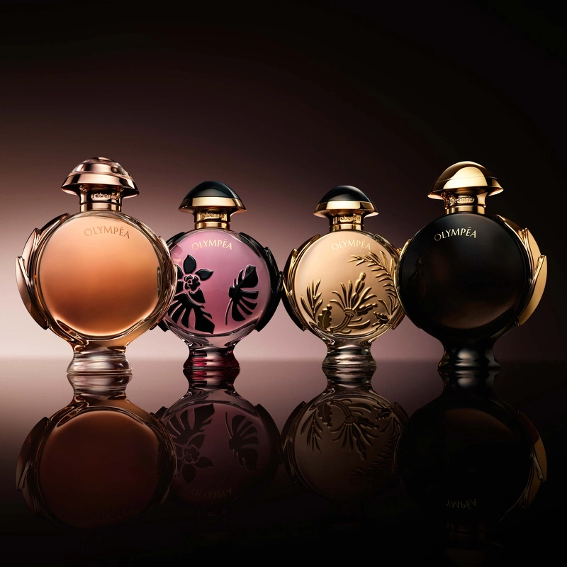 Gylden glamour. I en gyldentfarvet glasflaske, kronet med sorte detaljer og laurbærblade, stråler Olympéa Solar som solskin i fuld styrke.