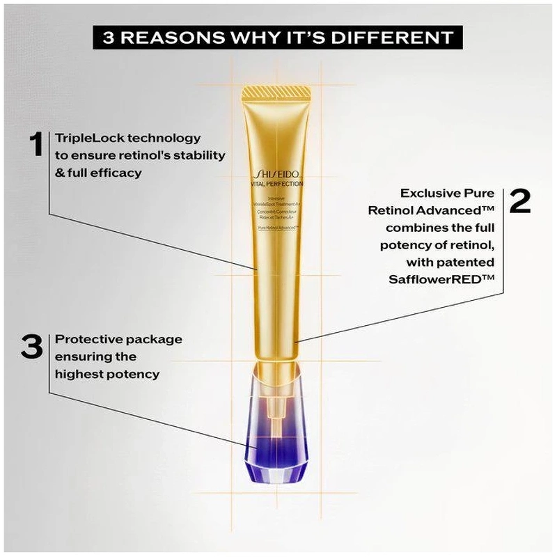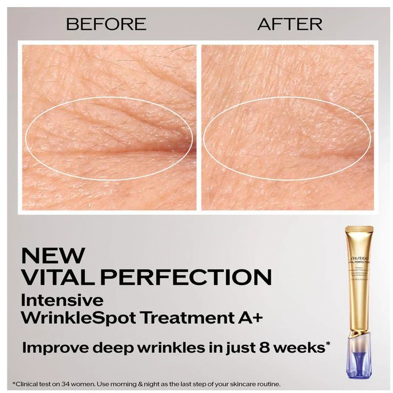 Shiseido Vital Perfection Intensive Wrinklespot Treatment A+ introducerer en super effektiv og målrettet behandling, udviklet til at imødekomme de specifikke behov hos moden hud. Takket være Pure Retinol Advanced™ virker denne innovative formel effektivt på synlige alderstegn: dybe rynker, mørke pletter og tab af fasthed.