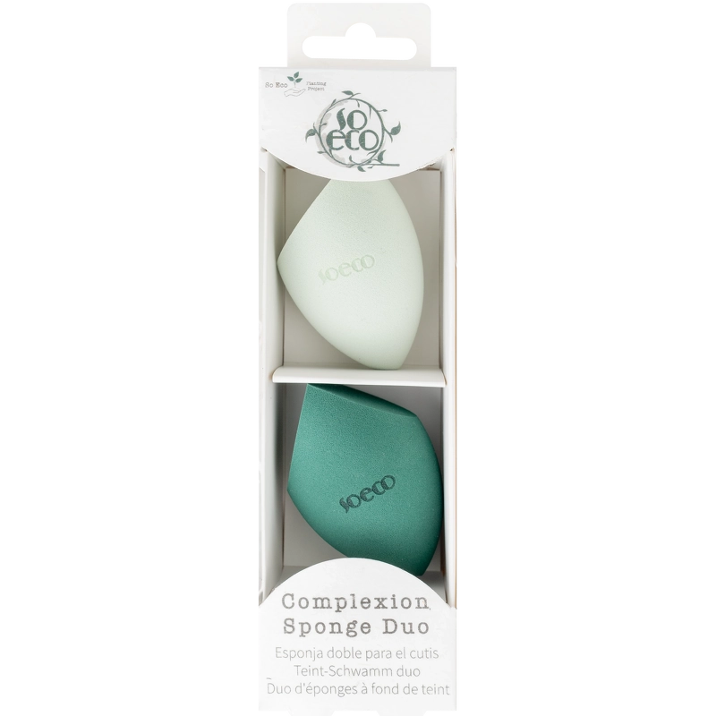 So Eco Complexion Sponge Duo er en sampak med to makeup svampe, som sikrer dig et smukt og fejlfrit resultat. Svampene er perfekte til påføring af flydende foundation, og ved at duppe den på huden med svampen, opnår man et smukt airbrush look. Svampene har to forskellige forme, og de runde sider egner sig særligt godt til påføring på større områder, mens kanterne er ideele når man skal påføre sin foundation præcist og på smalle steder.
